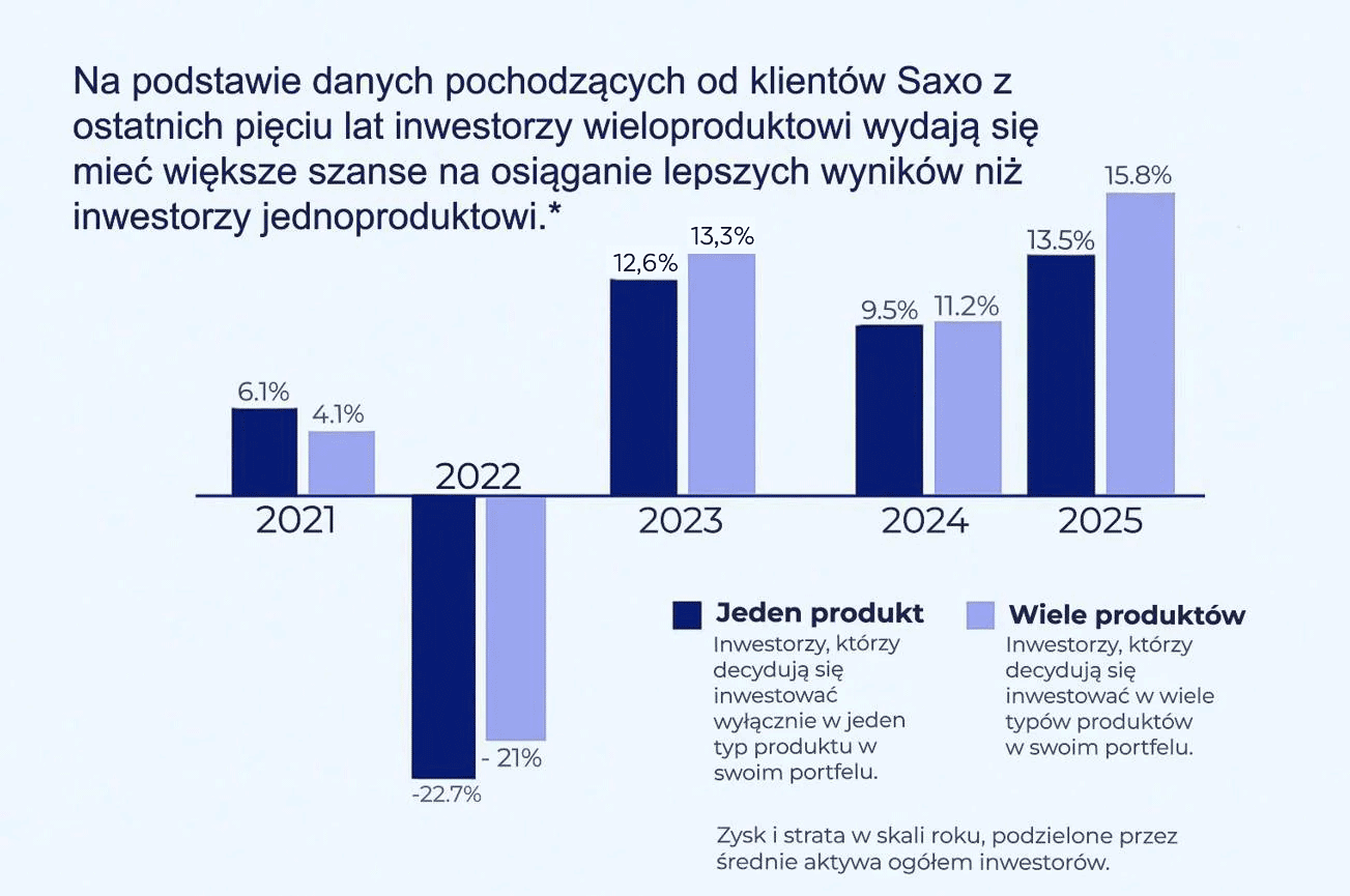 Z analizy zagregowanych danych dotyczących aktywności klientów Saxo z ostatnich pięciu lat wynika, że osoby korzystające z więcej niż jednego typu produktu częściej osiągały wyższe stopy zwrotu niż klienci ograniczający się do jednego typu produktu (np. wyłącznie akcji)